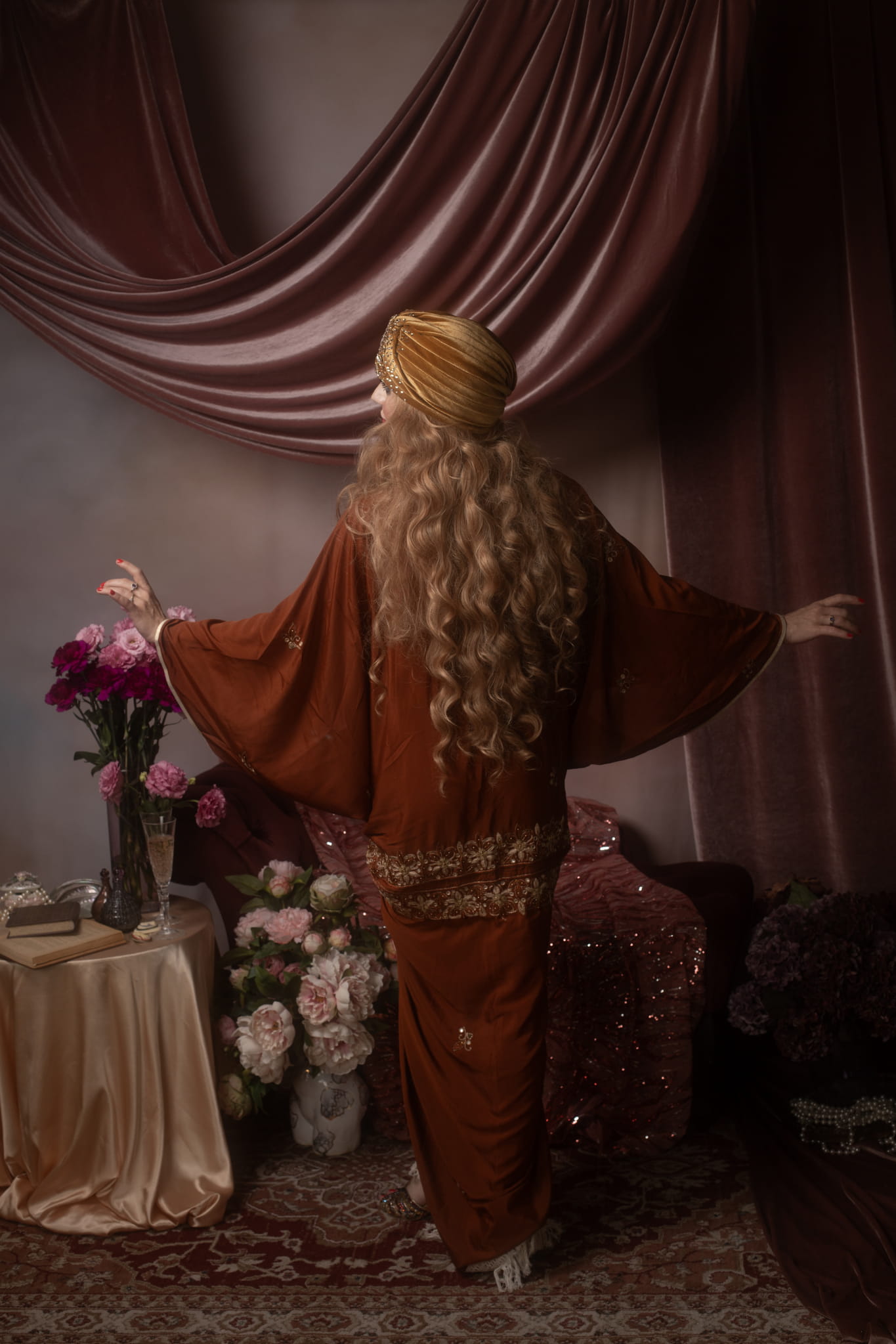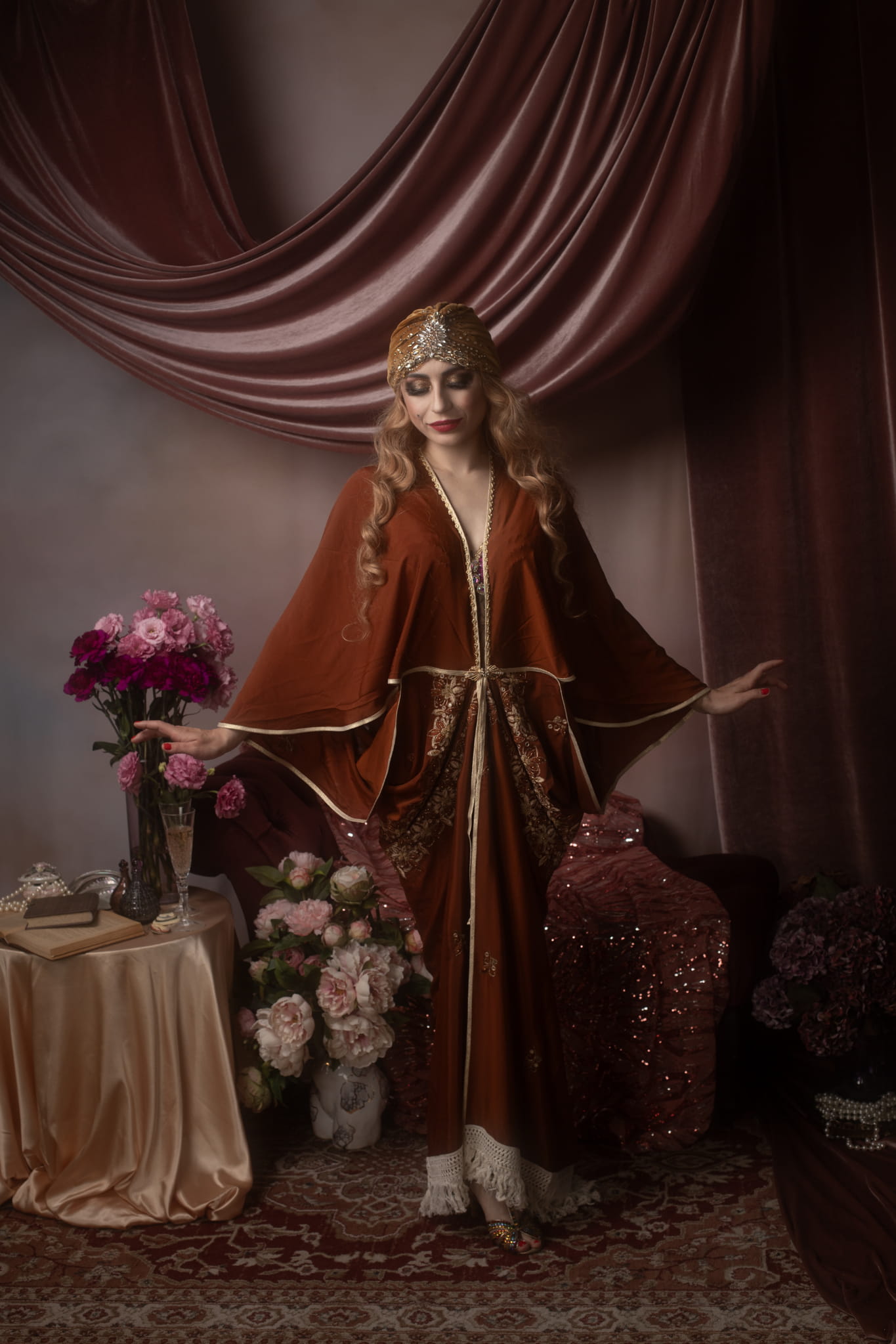 The flowing art deco sleeves create a graceful silhouette. Perfect for luxurious lounging, layering over lingerie, or adding an elegant statement piece to a performance or photoshoot, this robe blends comfort with timeless glamour.
