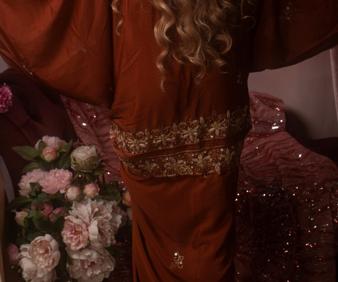 - Color: Deep rust with gold embroidery, light bottom finish