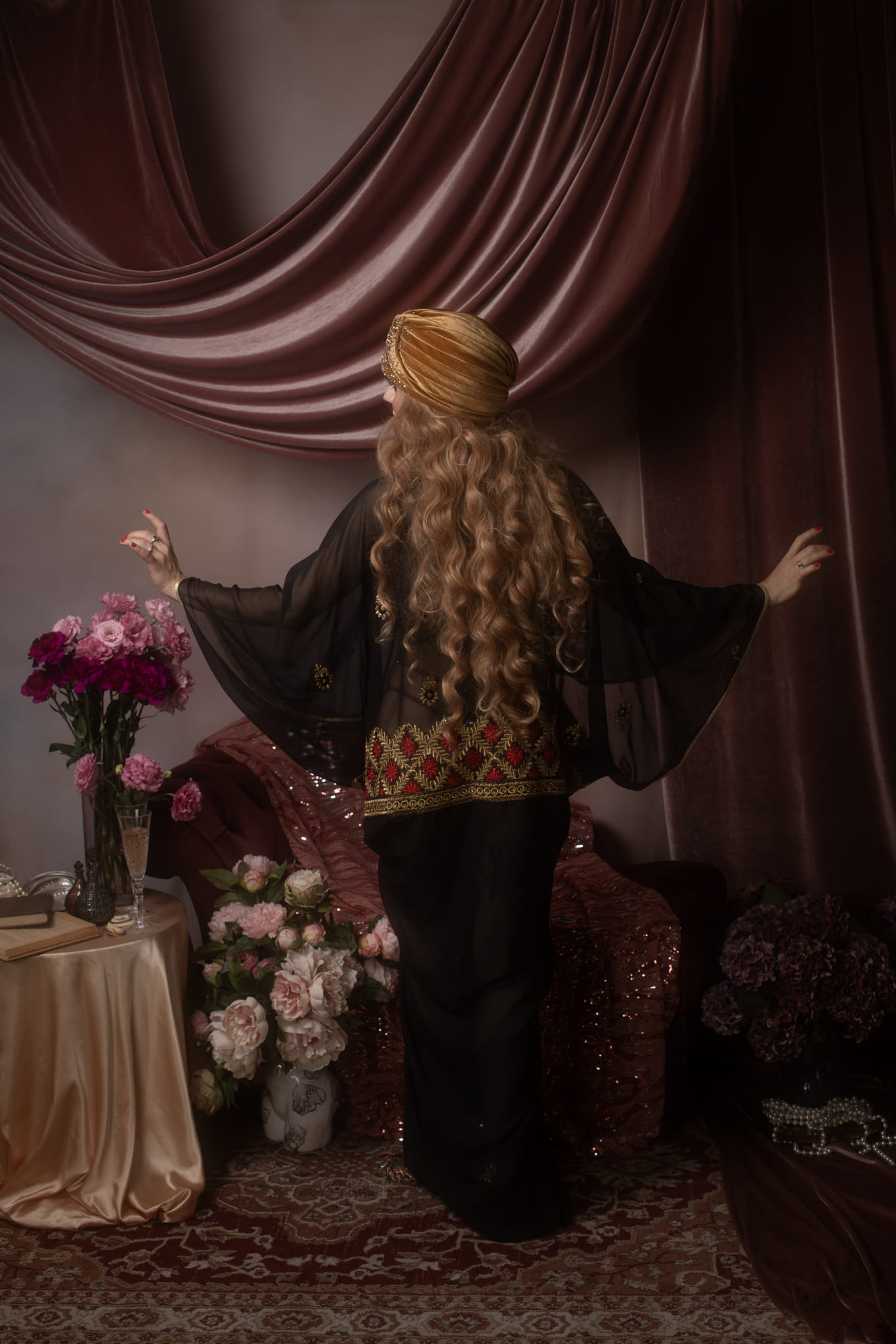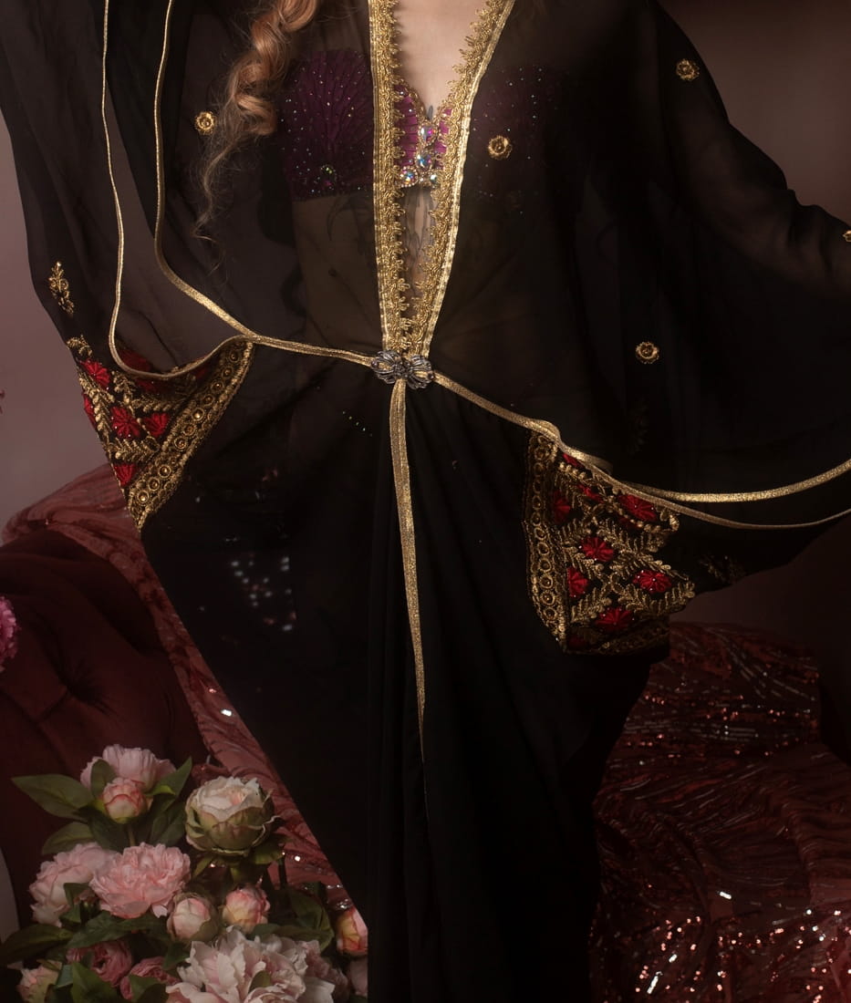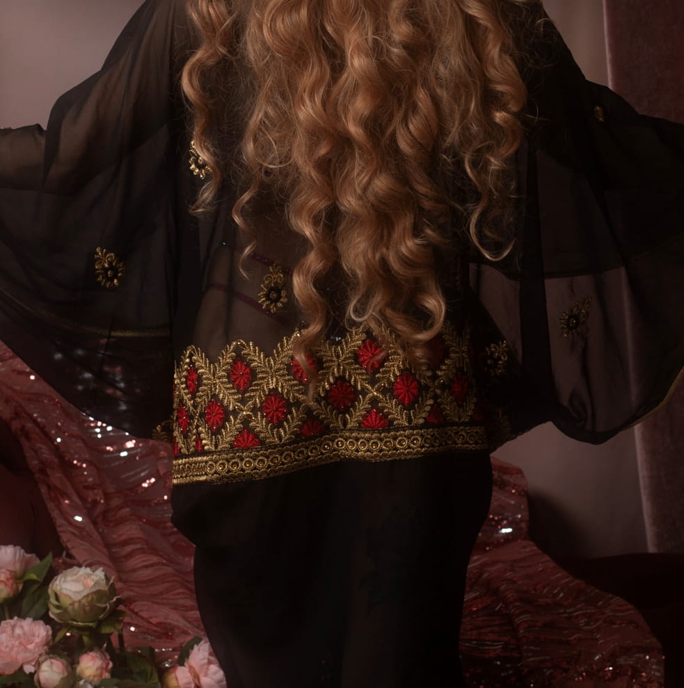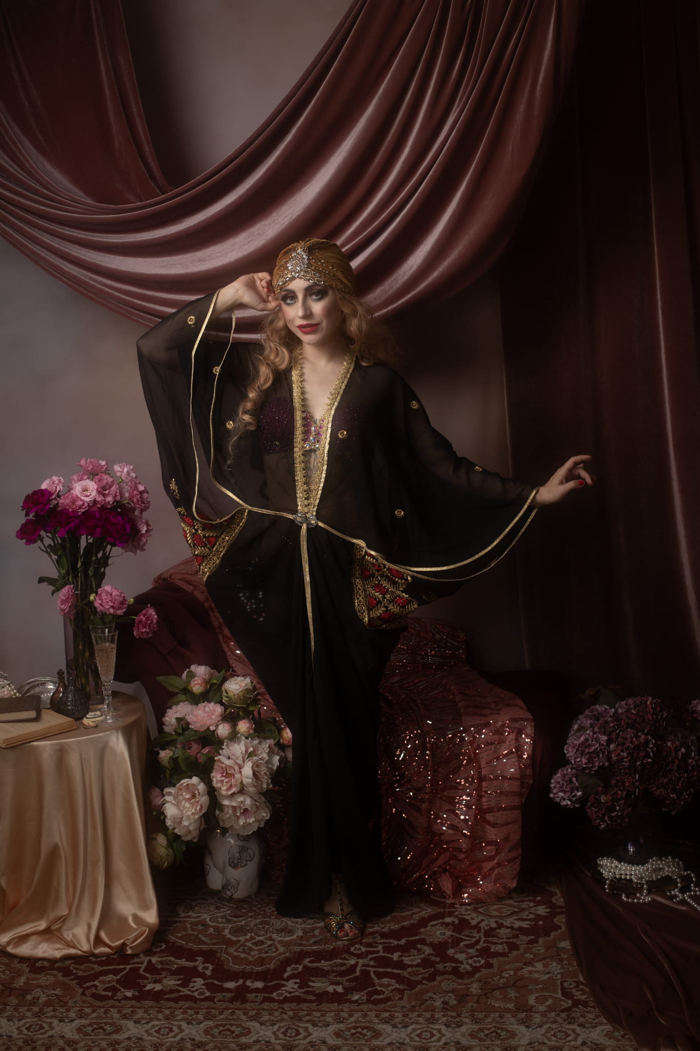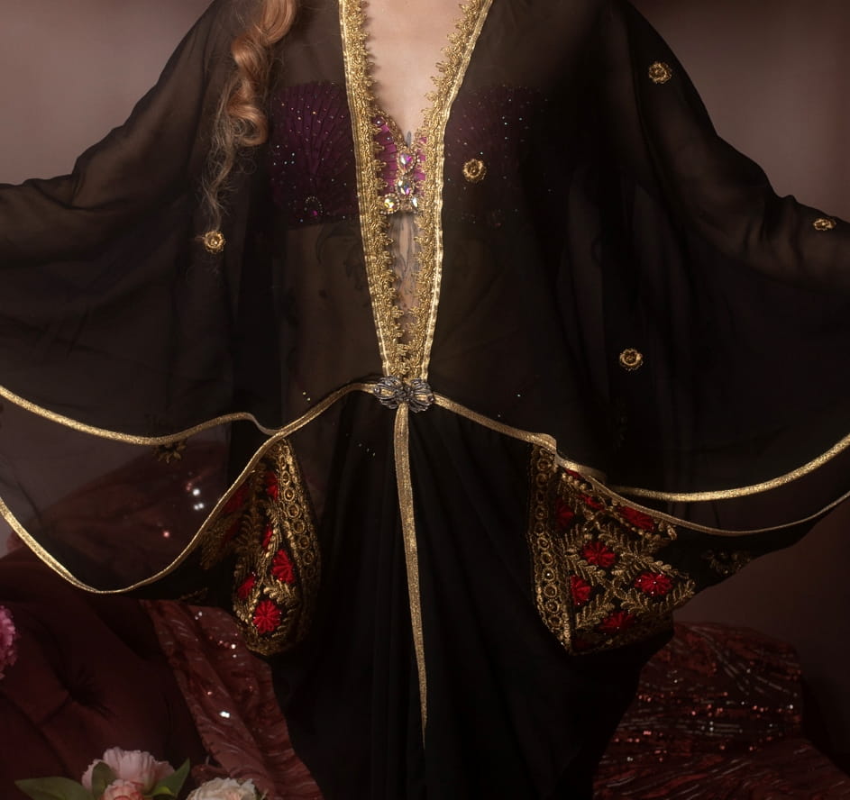 Elegant Black Gown with golden&red motif Art Nouveau Vintage-style L/XL