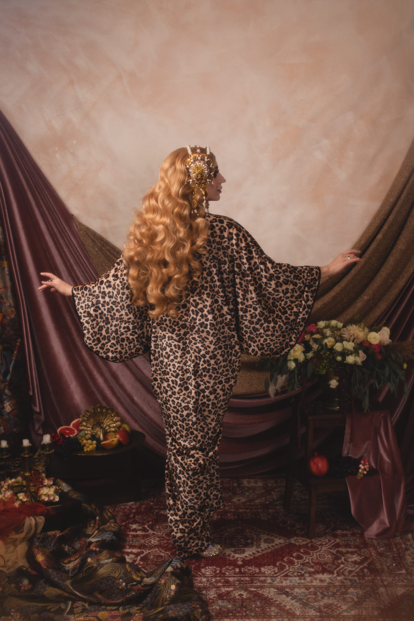 Whether worn as indulgent loungewear or an eye-catching layer for a special occasion, it evokes the dreamy elegance of a silent film star or a jazz-age muse.