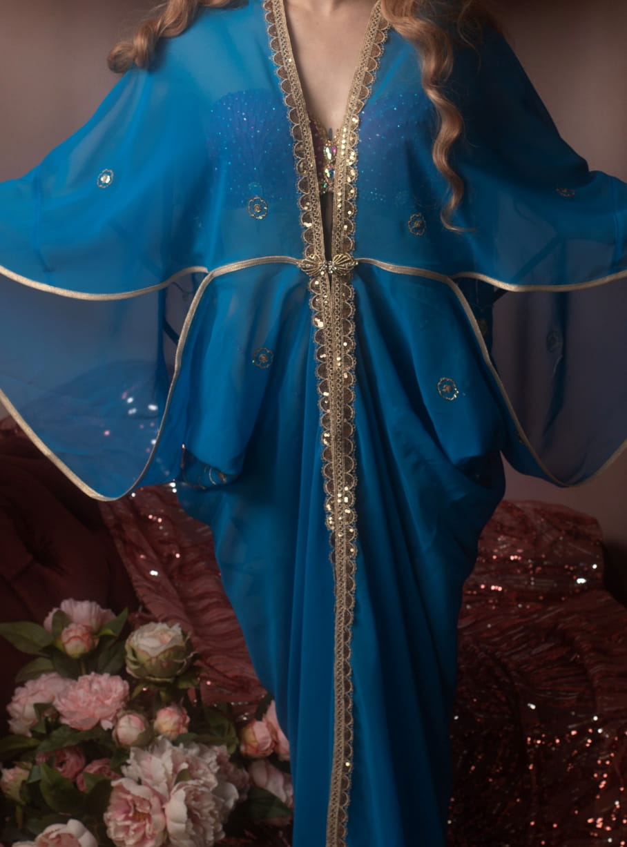 Romantic Blue Gown with flower motif Art Nouveau Vintage-style S/M