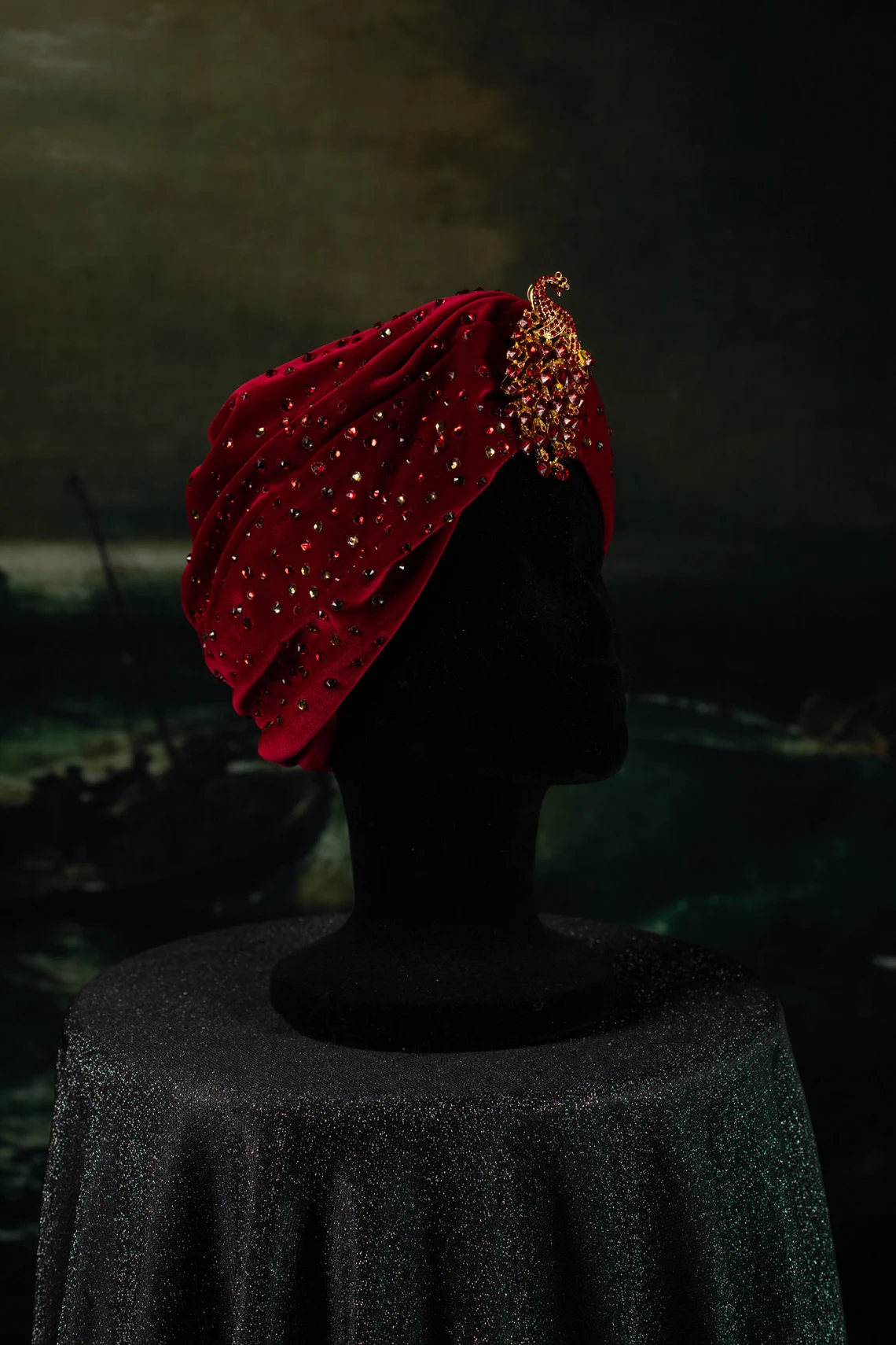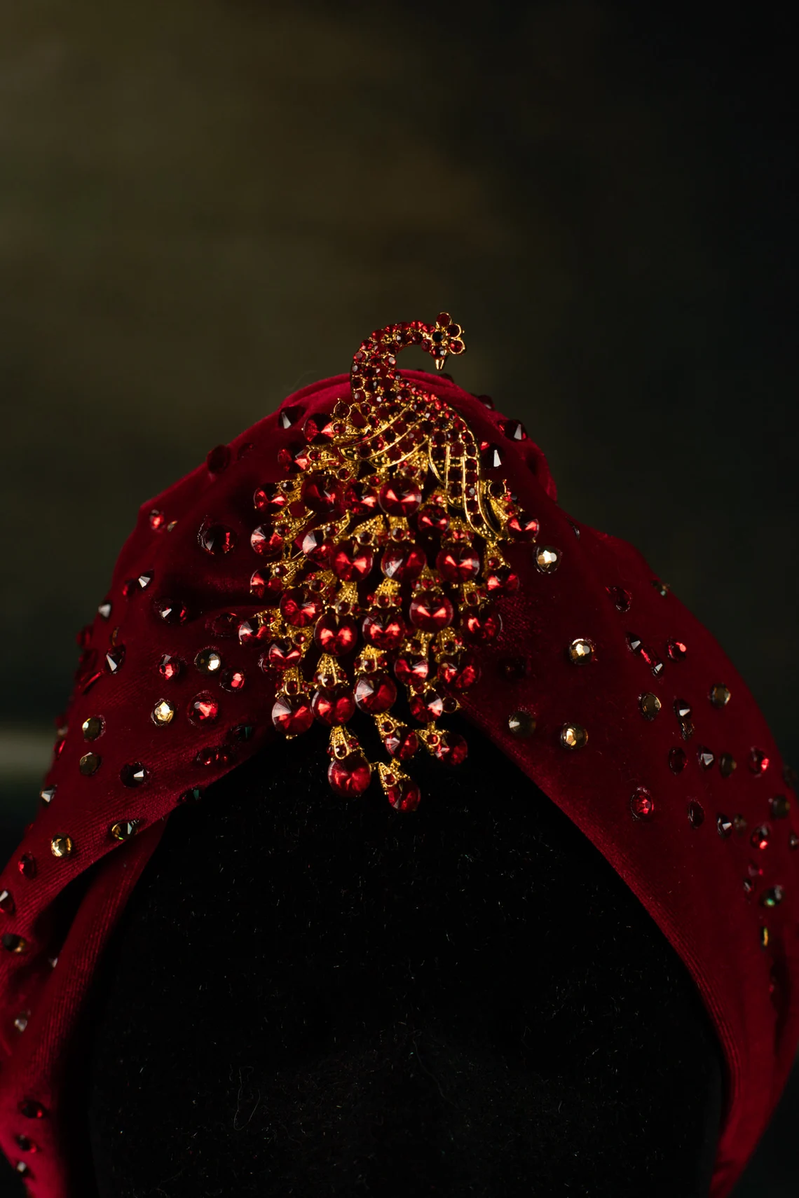 Royal Red color Velvet Turban with Brooch & Crystals 1920s-Inspired Art Deco style