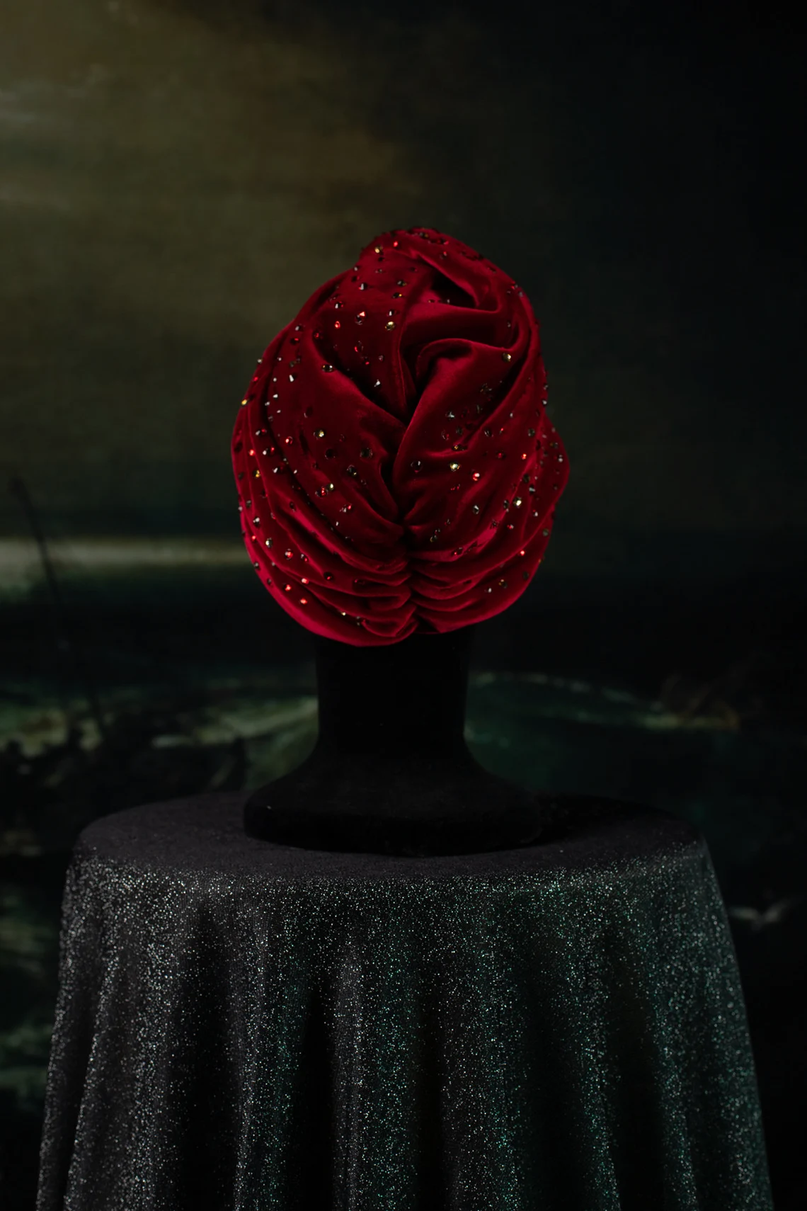 The turban is sewn entirely by hand from luxurious velvet that softly embraces the head, offering both comfort and timeless sophistication. Each crystal is placed with care, adding depth, shimmer, and a touch of theatrical decadence to the design.