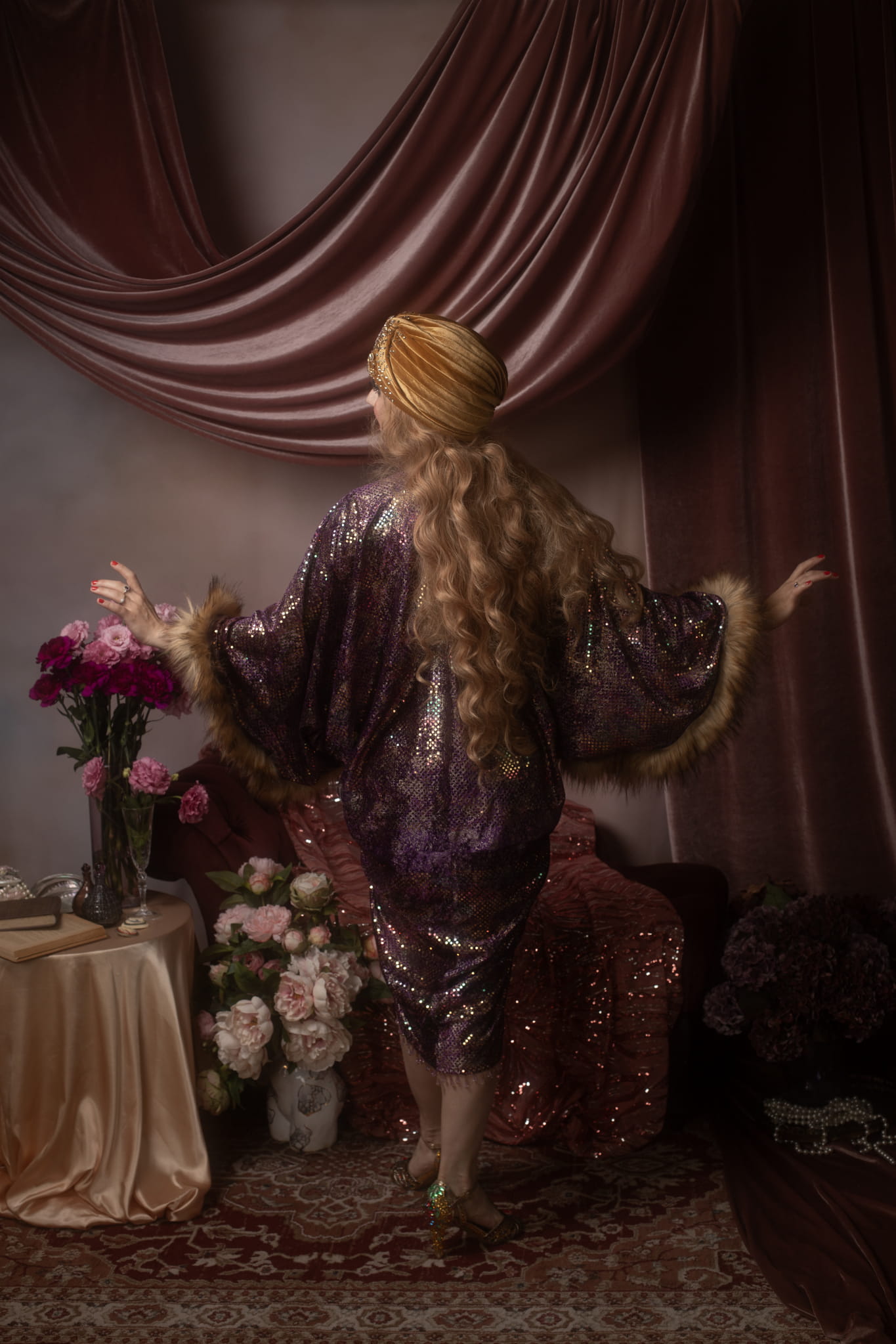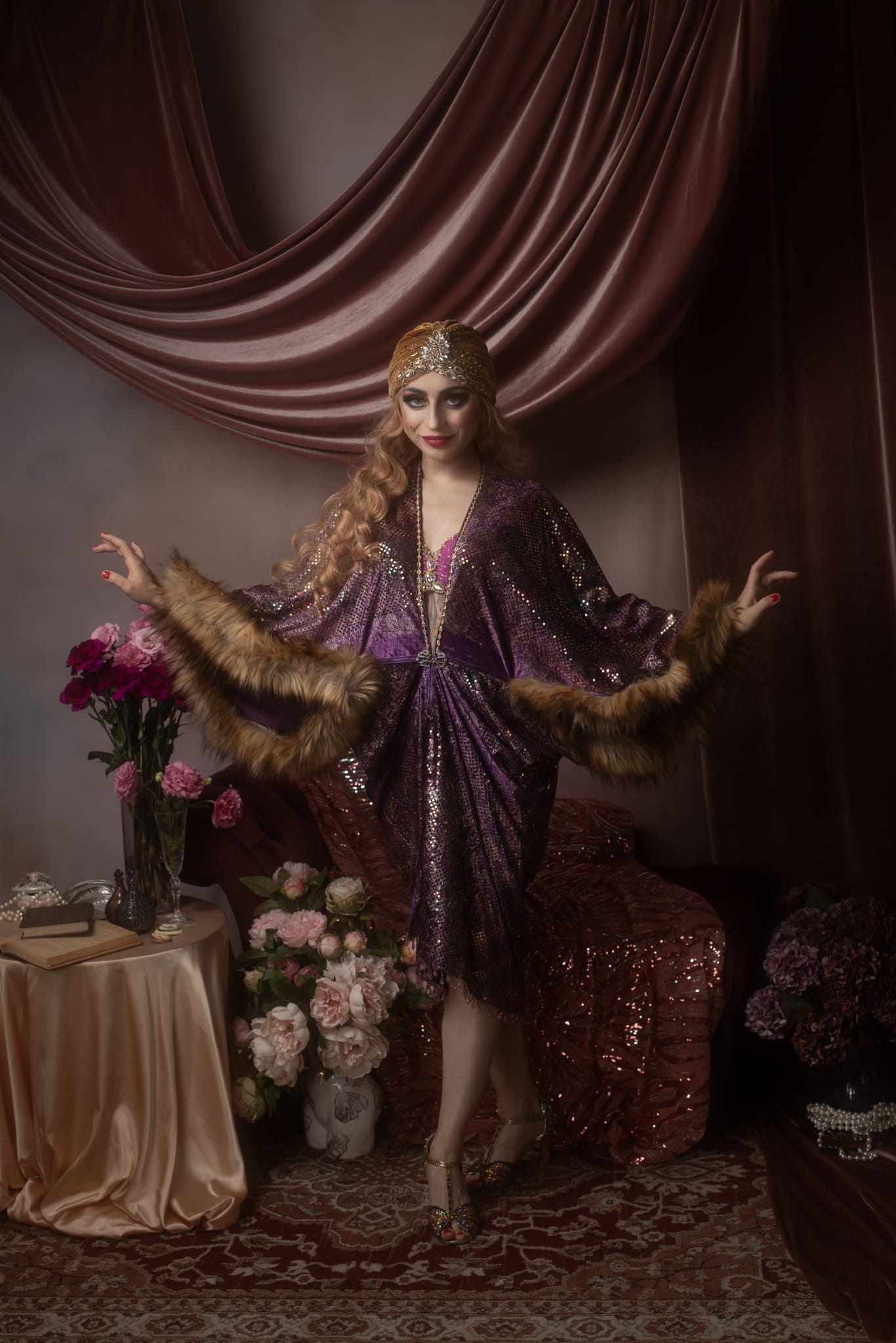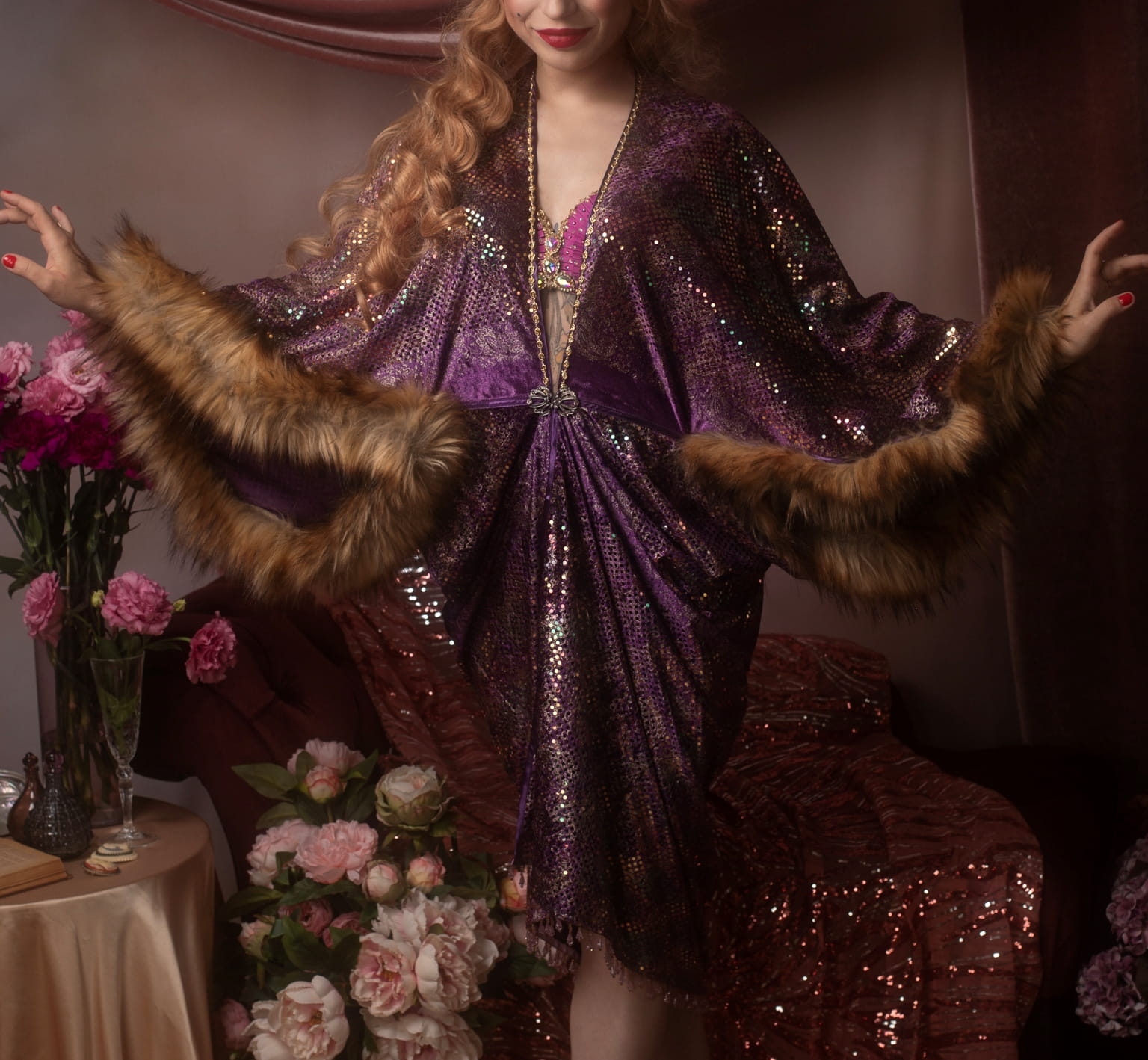 Sleeves: Wide, loose Art Deco-style sleeves trimmed with faux fur