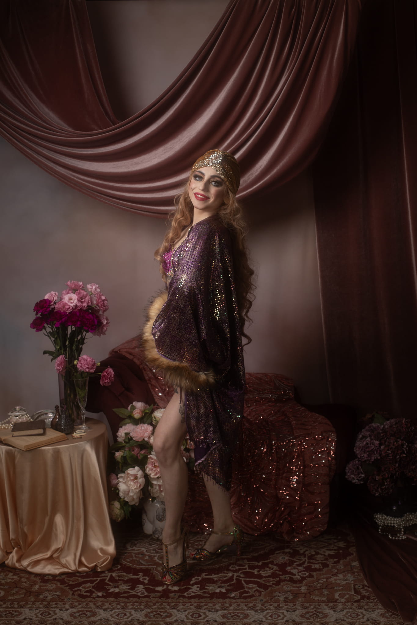 Short Sparkly Purple Gown with faux fur Art Deco Robe Vintage-style S/M