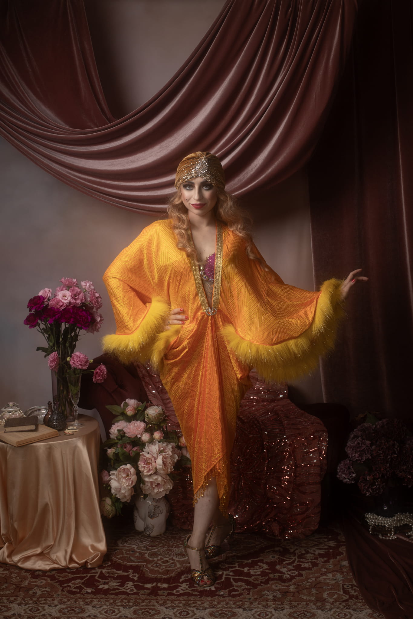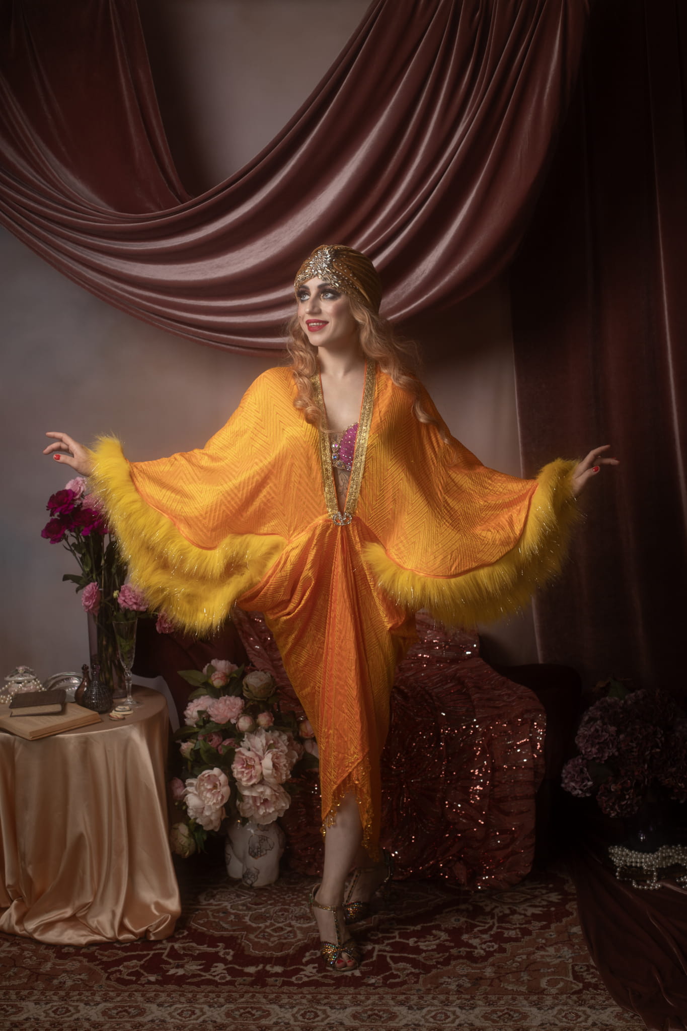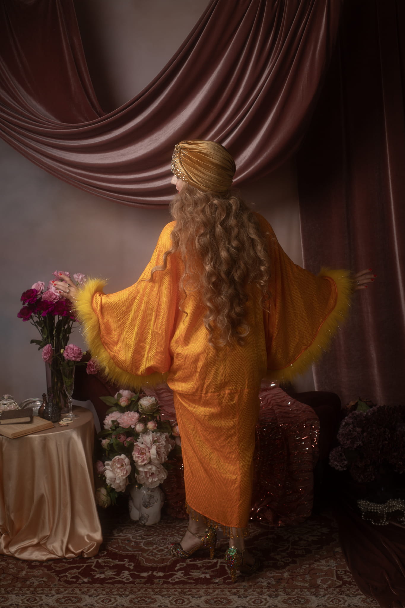 Short Yellow Gown with faux fur Art Deco Robe Vintage-style S/M